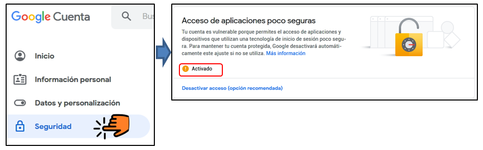 Entramos en en el menú “Seguridad” y comprobamos que el acceso de aplicaciones poco seguras está “Activado”.