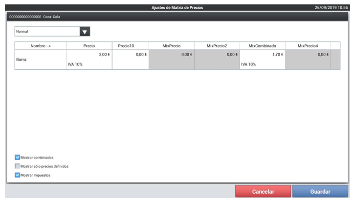 Además de estas 10 columnas, tenemos otras 10 columnas para su posible combinado, es decir, cada fracción puede tener otro precio al estar combinada con otro artículo. Al deslizar con el dedo los distintos precios de las fracciones, veremos que luego aparecen los precios de los combinados. Hay que “marcar” la casilla “Mostrar combinados”.